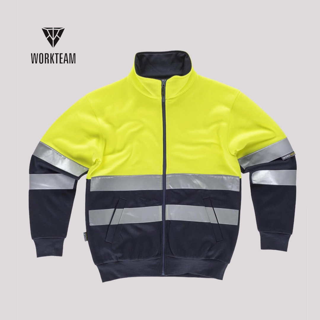 Felpa da lavoro alta visibilità Workteam bicolore con zip intera, bande rifrangenti e collo alto. Interno morbido, polsi e girovita elastici, realizzata in poliestere 280 g/m² resistente e comodo.