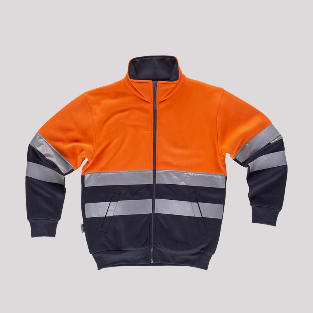Felpa da lavoro alta visibilità bicolore con zip intera, progettata per garantire sicurezza, comfort e calore durante le attività professionali. La parte superiore del capo in colore ad alta visibilità, combinata con due bande rifrangenti su petto, schiena e maniche, aumenta la visibilità dell’operatore in condizioni di scarsa luce o traffico intenso. Dotata di collo alto con cerniera in nylon, cuciture rinforzate e interno morbido, assicura protezione e comfort anche durante lunghe giornate lavorative. Due tasche laterali interne offrono praticità per piccoli oggetti, mentre polsi e girovita elastici in punto cannatè garantiscono una vestibilità stabile.