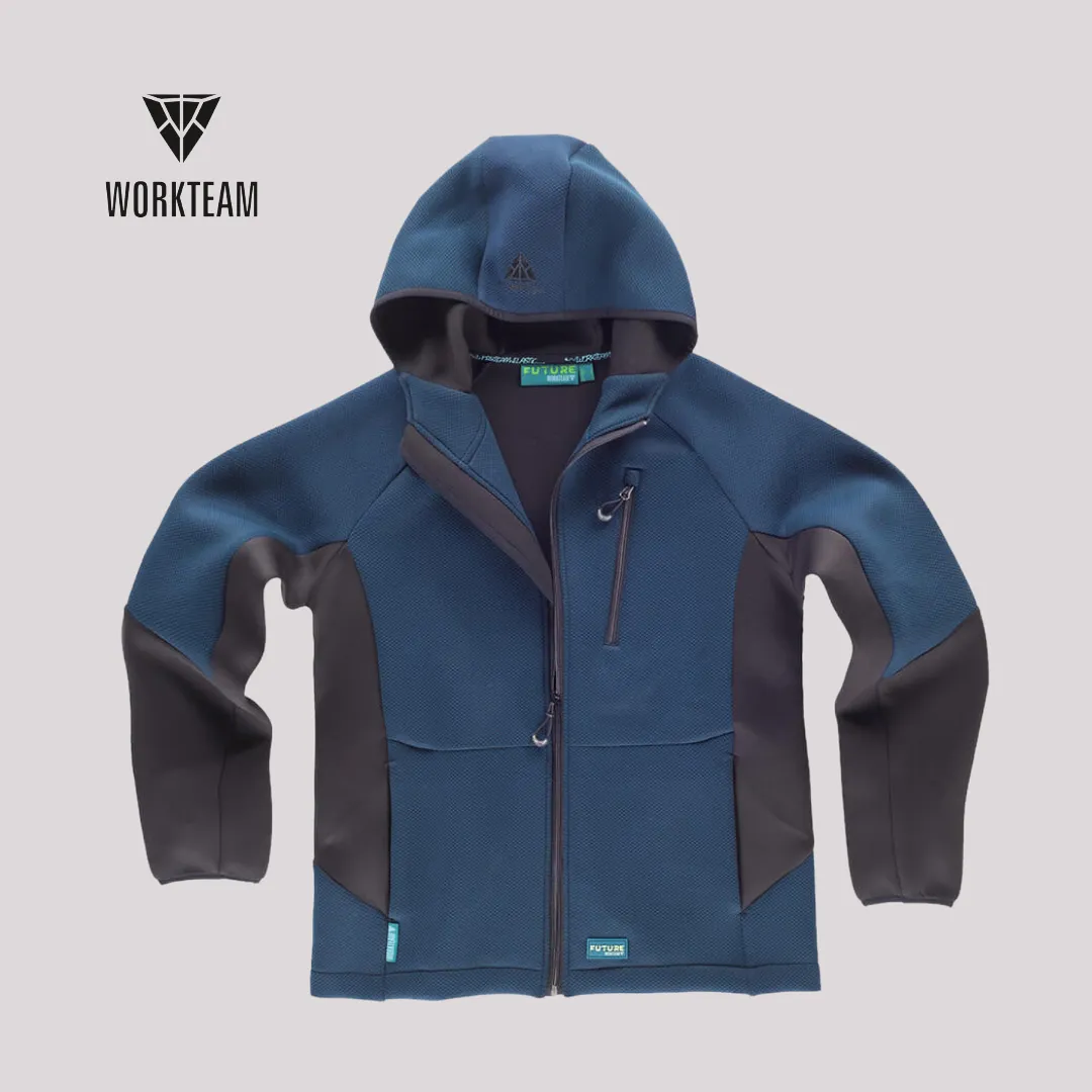 Giacca bicolore con zip lunga e cappuccio, pensata per garantire comfort e libertà di movimento durante le attività lavorative. Realizzata in tessuto tecnico da 340 g/m², combina resistenza, calore e dettagli ergonomici come manica raglan e collo alto.